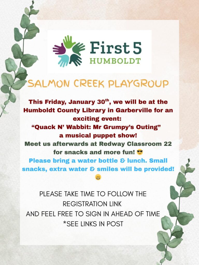 Every second Friday we meet at Garberville Library for story-time, songs and crafts with the librarians from 11 – 12, and then meet up somewhere near by after for more fun and snacks.
