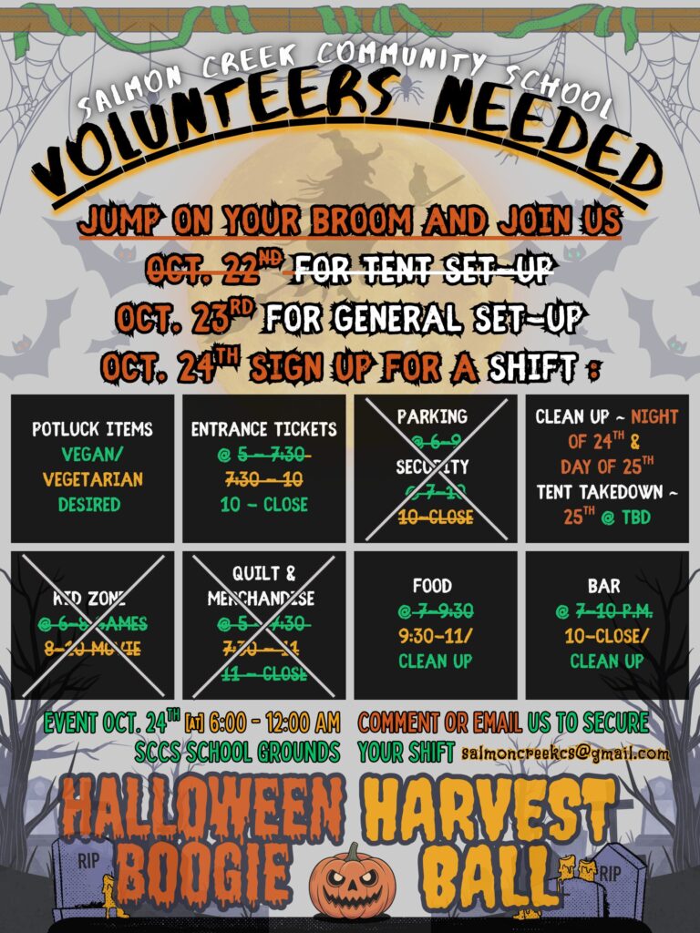 We are bone deep in organizing our annual Harvest Ball, and we need YOUR help! If you’d like to volunteer for Salmon Creek Community School, we have various places and times we need support in. Check out the flyer and see where you may be able to contribute. Reach out to sign-up/let us know how you’d like to help.